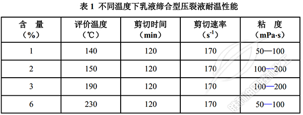 乳(rǔ)液締合型壓(ya)裂液可用于(yú) 150℃~230 ℃地層溫度 (見(jian)表 1)。