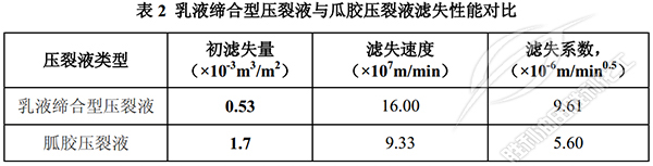 壓裂液的濾(lǜ)失性是影響(xiǎng)壓裂液造縫(feng)能力的重要(yào)因素,利用濾(lü)失儀在實驗(yàn)室條件下,對(duì)乳液締合壓(yā)裂液與常規(guī)瓜膠壓裂液(yè)濾失性能對(dui)比 (表 2 )。
