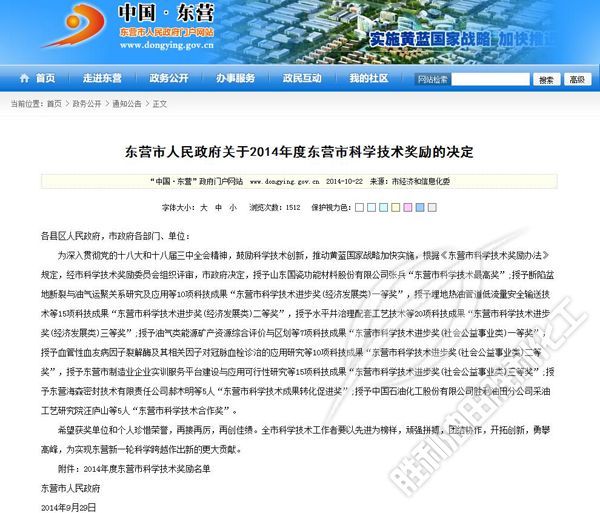 《東營市人(rén)民政府關于2014年度(dù)東營市科學技術(shu)獎勵的決定》