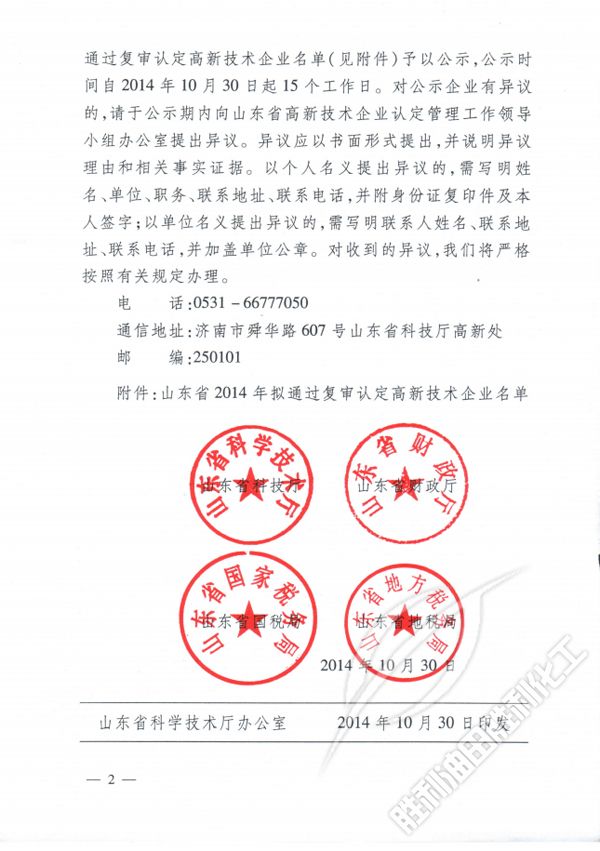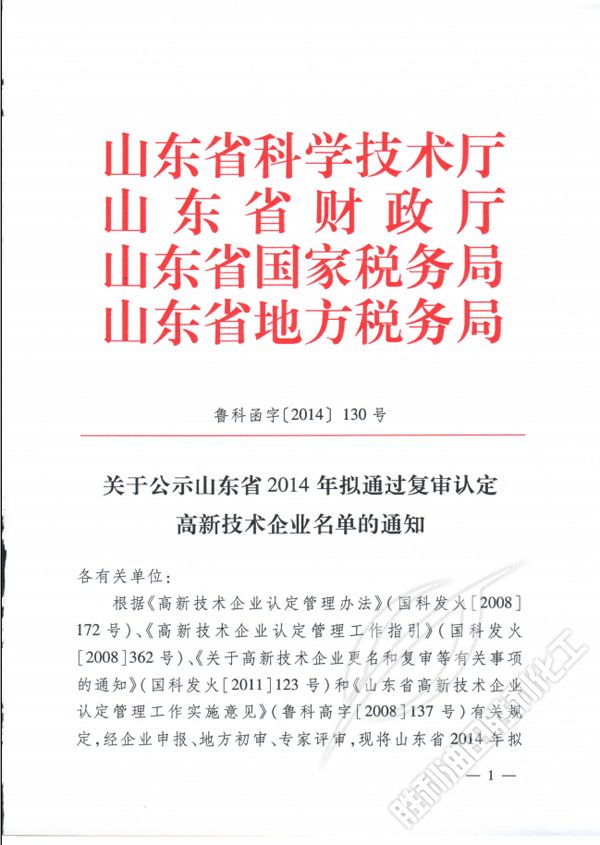 關于公示山東(dōng)省2014年拟通過複審(shen)認定高新技術企(qi)業名單的通知